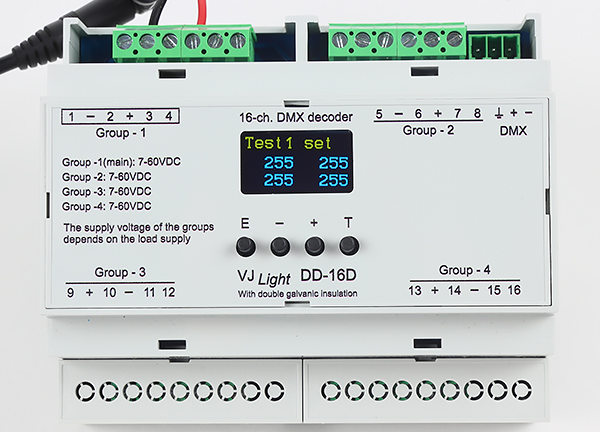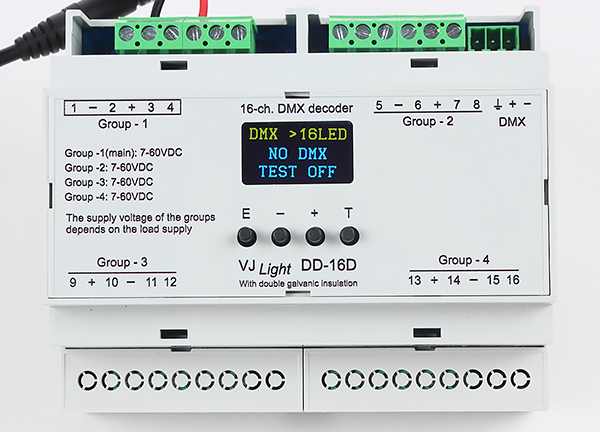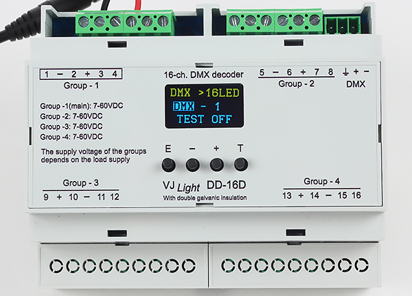 DMX декодер ​​ВиджейСвет (VJLight) DD-16D предназначен для управления яркостью светодиодных лент, светодиодов и другой подобной нагрузкой с напряжением питания в диапазоне 7-60VDC и мощностью до 10А на канал, а при достаточной вентиляции - до 20-25А на канал.  Данный декодер может работать в 16 канальном и в 8 канальном режиме. При работе в 8-канальном режиме, выходы продолжают работать в режиме дублирования, т.е., если в 16-канальном режиме выходы 1, 2, 3 и 4 работают на 1,2,3 и 4 канале DMX, то в 8-канальном режиме 1,2,3 и 4 каналы DMX управляют выходами  объединенными в пары: 1-2, 3-4, 4-5 и 6-7, соответственно.