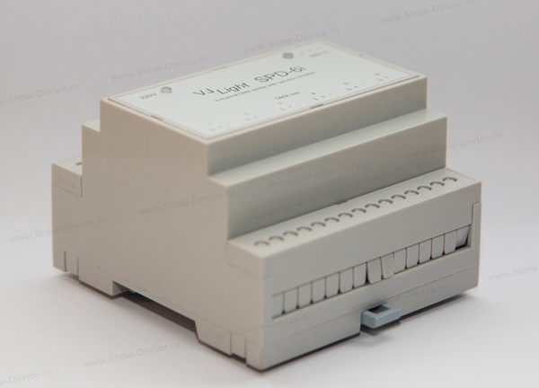 Представляем вашему вниманию DMX сплиттер 6 каналов для установки на DIN рейку ВиджейСвет (VJLight) SPD-6i с двойной гальванической развязкой, а так же индикаторами питания и наличия входящего сигнала DMX. Данный сплиттер предназначен для усиления сигнала DMX и разветвления одной линии входящего сигнала на шесть. Это отличное инсталляционное решение для клубов, ресторанов, частных домов, квартир и даже прокатчиков. Он имеет один трех контактный DMX вход и шесть трех контактных выходов с гальванической развязкой по питанию и гальванической развязкой для передачи сигнала DMX каждого выхода. SPD-6i выполнен в ударопрочном пластиковом корпусе и предназначен для установки в щит электроснабжения на DIN рейку. DMX сплиттер подключается непосредственно к сети переменного напряжения AC 220В (85 ~ 264VAC 120-370VDC), но возможна поставка с напряжением питания постоянного тока 7-60 VDC. Каждый DMX вход и выход питается от своего источника питания (гальванически развязанного от других ИП), DMX каналы ретранслируют сигнал через гальваническую развязку, что в случае выхода из строя световых приборов или неисправности линии DMX обеспечит защиту приборов подключенных к другим линиям сигнала управления. В качестве гальванической развязки используются уже не оптроны, а более совершенный, скоростной (до 1024 каналов DMX на выходе) и надежный метод, лишенный таких недостатков светодиодов, как их деградация в процессе эксплуатации. SPD-6i имеет встроенную защиту от перенапряжения, короткого замыкания и т.д. Для удобства инсталляции подключение осуществляется через разъемные терминалы 15EDGKB-3.5-03P-14-00A(H) (Входят в комплект). После соединения терминалов с контактами отсеки закрываются крышками, прижимая провода (можно подрезать ламели крышки на нужную длину) и закрывая от доступа.